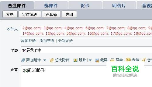 登录我们的qq邮箱,按正常方式先写好一份邮件,然后在收件人中添加你要发送的邮箱账号,如果都是你自己的qq好友的话,可以全部添加为收件人,如果不是,建议你一次添加收件人不要超过20个,这样能保证发送成功率。