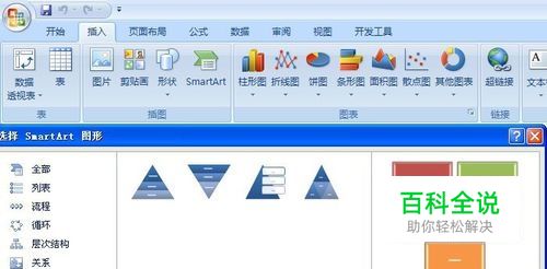 打开一个Excel的文件,选中一个单元格,然后鼠标左键单击菜单【插入】>>【SmartArt】>>【棱锥图】,如下图所示。