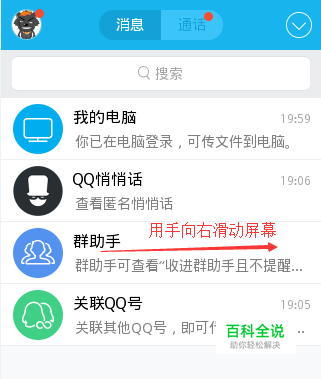 登录手机qq后,在手机qq主界面上用收向右滑动屏幕,打开设置入口,如下图所示。