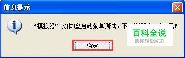 弹出如下对话框。因为是模拟启动,所以确定按钮是灰色的。到这一步为止,证明我们的U盘启动是成功的。