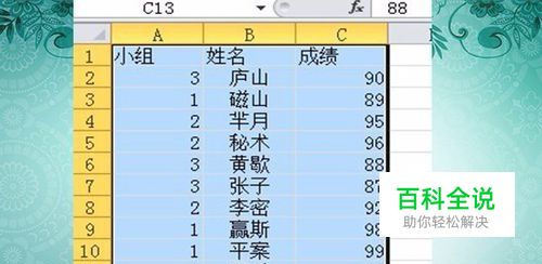最后点击确定,就将:小组1中成绩大于90分的区域筛选了出来。