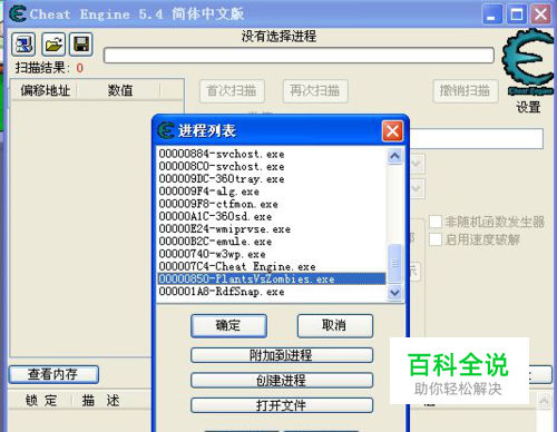1、打开游戏并运行在窗口模式,再打开CE,点击左上角电脑图标->选中进程->确定,如下图: