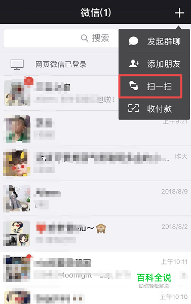 这时候就需要拿出手机,然后打开手机内的微信。打开之后点击右上角的加号,在弹出的菜单中选择“扫一扫”选项,然后将二维码扫描框对着电脑刚刚打开的网页中显示的二维码进行扫描。