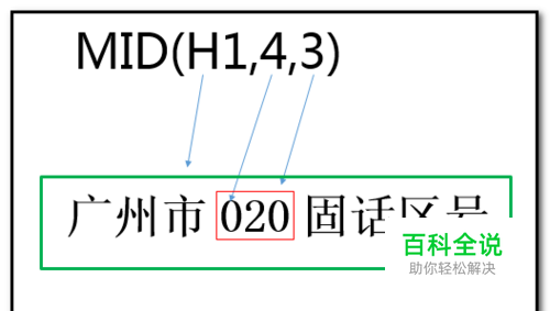 公式:=MID(H1,4,3)的函数MID有截取的作用;H1,是数据所在单元格;4 是要从哪个字符开始截取(单元格字符串是从左边开始数的)020的0位于字符串的第4位;3 是要截取几位的字符,这里的020是三位。
