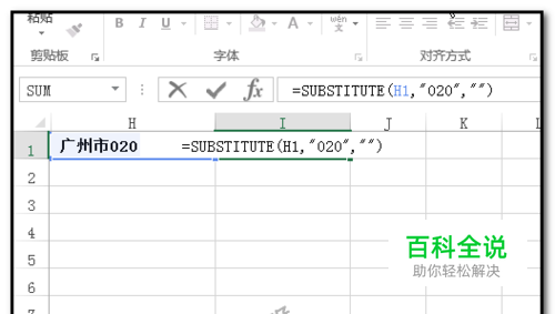 接着,我们再来提取汉字到 I1 单元格 在I1单元格输入公式:=SUBSTITUTE(H1,"020","") 按下回车键,即可得出结果。 SUBSTITUTE是替换函数,把020替换成为空,即可以把数字删除掉,留下汉字。