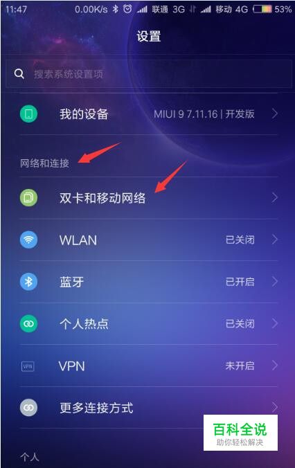 打开手机“设置”,在”网络和连接“栏目下找到”双卡和移动网络“,点击进入。