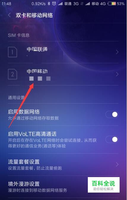 在”sim卡信息“栏目下找到自己的4G手机卡,我的是中国移动,所以我选择中国移动,点击进入。
