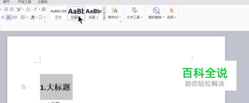 首先,将word文档打开,然后进行设置标题,选中大标题,再选择菜单栏上的标题1。