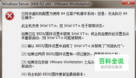 VMware Workstation 10虚拟机安装64位windows server 2008 R2系统时报错“Intel VT-x处于禁止状态”,如下图。