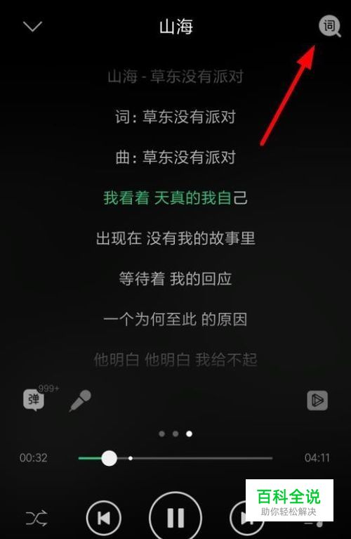 首先我们打开手机QQ音乐。选择一首歌在歌词的右上角。会看到一个“词”字,我们点击。