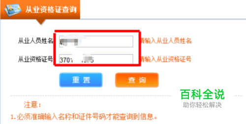 2.接着在【从业人员姓名】那一栏中输入要查询的证件人姓名,在【从业资格证号】那一栏输入要查询的证书编号(通常是十位数那个黑色字体的编码),然后点击下方的【查询】按钮。