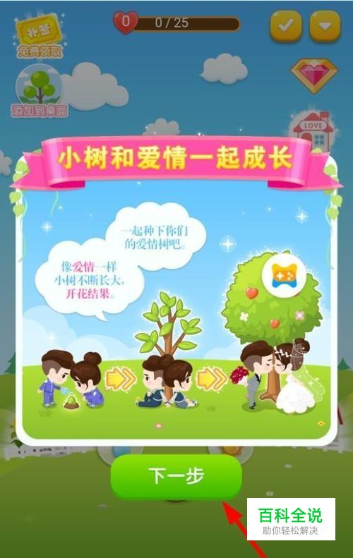 我们点击这个种子,进入种植小树页面,“小树和爱情一起成长”点击下一步。