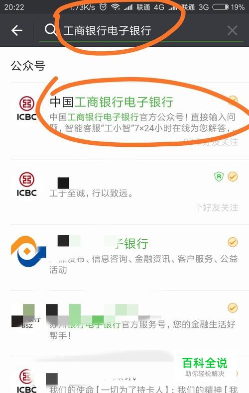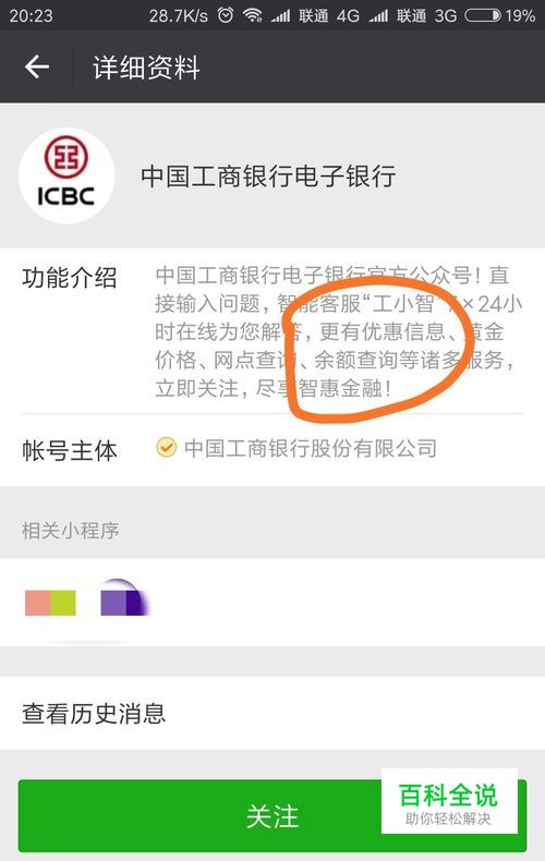 手机打开微信,进行公众号添加搜索“中国工商银行电子银行”公众号并进入点关注,如图所示。