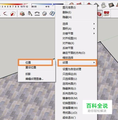 在这个面上单击右键,选择纹理-位置。 其他版本的表达会不同,可能会表达为“贴图-调整贴图”,一般都会在右键菜单里,仔细找找