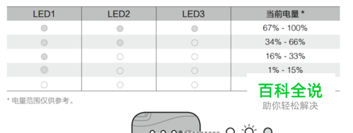 关机模式下,短按一次电源按钮,可查看当前电量。三个LED的点亮数量表示剩余电量的多少。