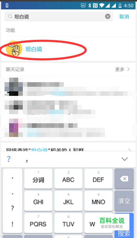 在搜索栏中,输入坦白说,搜索功能,找到并进入