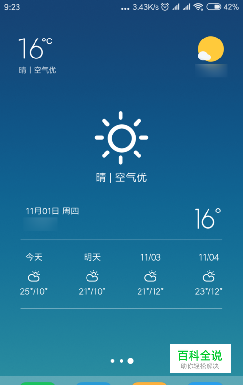 这就以小米手机为例了。 手机上的天气大概就是这样的,有当天的天气,也可以有近几天的天气情况。