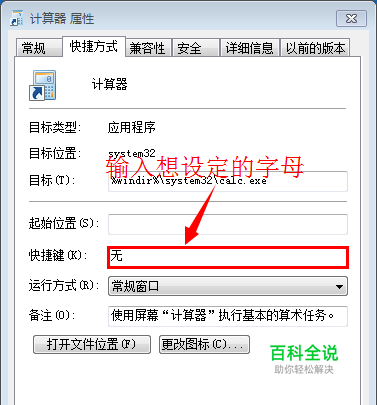 设置快捷键 点击属性中快捷方式,快捷键(K)后的方框中输入自己想设定的一个字母。如输入Q,计算机的快捷键就变成Ctrl+Alt+Q。最后点击确定或者应用就可以了。然后你就可以用Ctrl+Alt+Q调出计算机了,是不是很方便?
