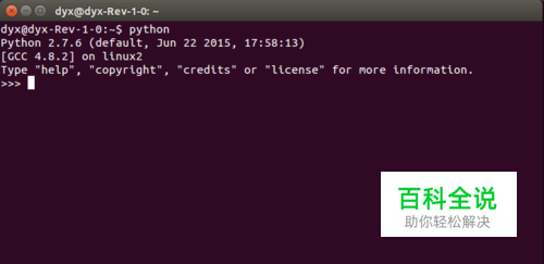 进入ubuntu系统,进入命令模式(可以按快捷键ctrl+alt+t),在命令输入python命令,查看并确认系统安装python版本为2.7以上(本教程系统为ubuntu14.04,python 版本为2.7.6)。