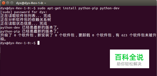 执行上述步骤,确认无误后,在命令窗口输入命令:sudo apt-get install python-pip python-dev,输入密码后按回车执行,输入后会出现一串代码,然后问是否继续,输入y回车。然后可以静待安装完成。