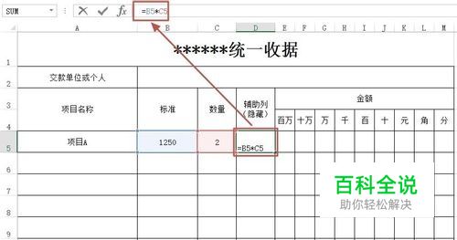 输入项目名称、标准、数量,然后添加辅助列,输入计算公式,如下图所示。