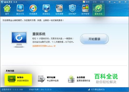 使用金山卫士3.0为您更新显卡驱动。打开金山卫士3.0,进入“装机精灵标签” — 点击按钮“装驱动”