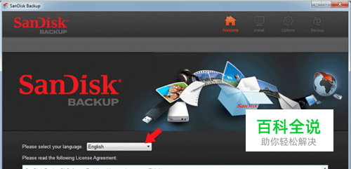 步骤 3 - 安装SanDisk Backup软件 1. 双击SanDiskBackup.exe执行文件。 2. 在下拉菜单中选择您喜好的语言。 注意: SanDisk Backup有19种语言可供选择(英语, 法语, 德语, 意大利语, 西班牙语, 葡萄牙语, 瑞典语, 丹麦语, 挪威语, 荷兰语, 俄语, 捷克语, 波兰语, 土耳其语, 韩语, 日语, 繁体中文, 简体中文和阿拉伯语)。