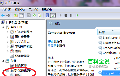 在计算机管理属性下,找到【 服务和应用程序】,再在服务和应用程序下找到【 服务】选项卡点击服务,则右边窗口就出现了很多服务类型。
