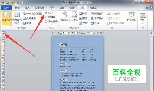 首先,打开已输入简历信息的Word2010文档,接下来点击视图选项卡,勾选显示功能区中的标尺。