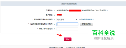 选择你要开通服务的类型【短信查询】,然后再输入发送接收短信服务的手机号码,获取一个验证输入到手机验证码处点击【添加】