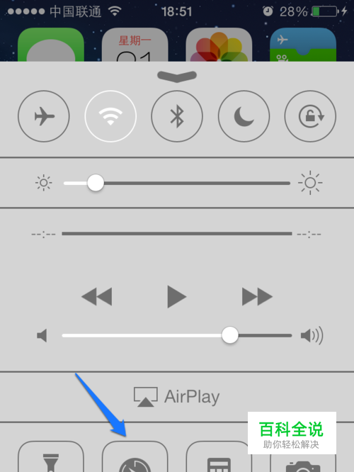 在 iPhone 主屏上用手指向上滑动,打开 “控制中心”界面,如图所示