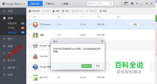 使用应用宝连接手机后,卸载一下系统自带的应用时会提示没有获得【root权限】,可以立即获取。