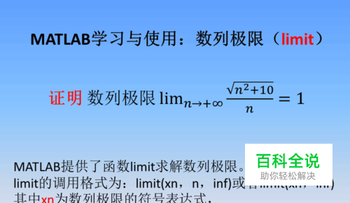 第二,启动MATLAB,在命令行窗口输入如下代码: syms n result=limit(sqrt(n^2+10)/n,n,inf) 回车得到返回结果: result = 1 说明(证明)该数列极限等于1