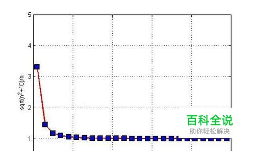 第三,利用MATLAB强大的绘图功能,观测数列极限的变化趋势。 新建脚本(Ctrl+N),然后在脚本编辑区输入如下代码: close all;clear all;clc n=1:2:50; result=sqrt(n.^2+10)./n; plot(n,result,'-rs','LineWidth',2,'MarkerEdgeColor','k',... 'MarkerFaceColor','b','MarkerSize',10) hold on; grid on; axis([0,50,0,5]); set(gca,'XTick',[0:10:50],'YTick',[0:1:5]); xlabel('n');ylabel('sqrt(n^2+10)/n')