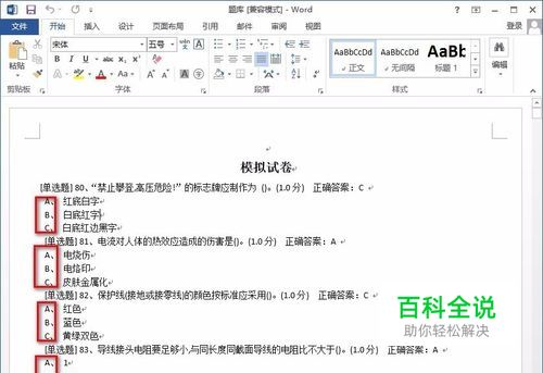 打开Word试卷。 查看里面选择题的选项有几个。比如图中的选项都是3个选项。 题干与选项之间是段落,选项与选项之间是段落。