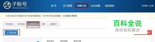 第二步:点击【客服分流】-【分组设置】,若当前没有组别,点击【添加分组】,若已经有组别了点击右上角的“小齿轮”,再点击【管理客服】添加需要的子账号到该组中,同时点击【设置规则】勾选是否显示在店铺及亮灯页面后,点击【确定】即可设置完成: