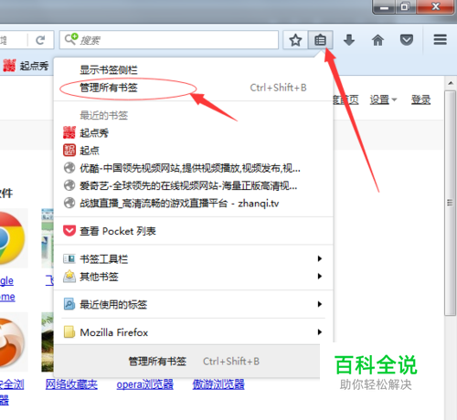 打开火狐浏览器,如图点击管理所有书签,进入书签管理;