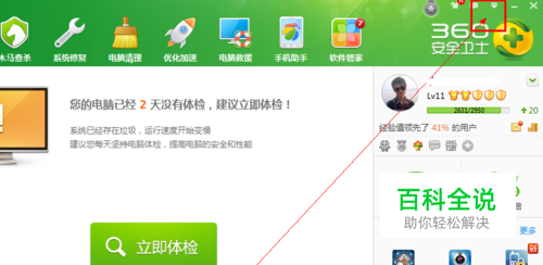 打开360安全卫士,在安全卫士的主界面的右上角有一个选项的三角形如图。