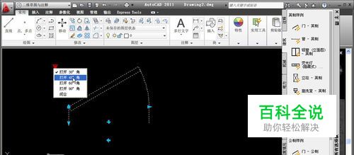 按CTRL+3,打开工具选项板,插入建筑选项板中的门的图块,可以看到门有一个可见性参数,可以设置门的开启角度为30、45、60等,如下图所示。