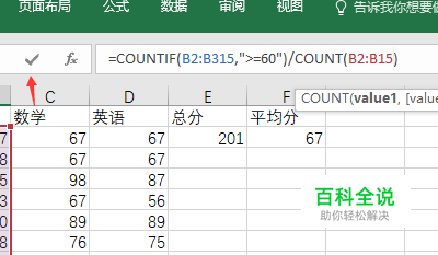 输入合格率函数并计算。点击上面输入函数框,然后输入=COUNTIF(B2:B315,">=60")/COUNT(B2:B15),因为是从B2到B15的,因此这里输入这两个数值,接着点击打勾即可。