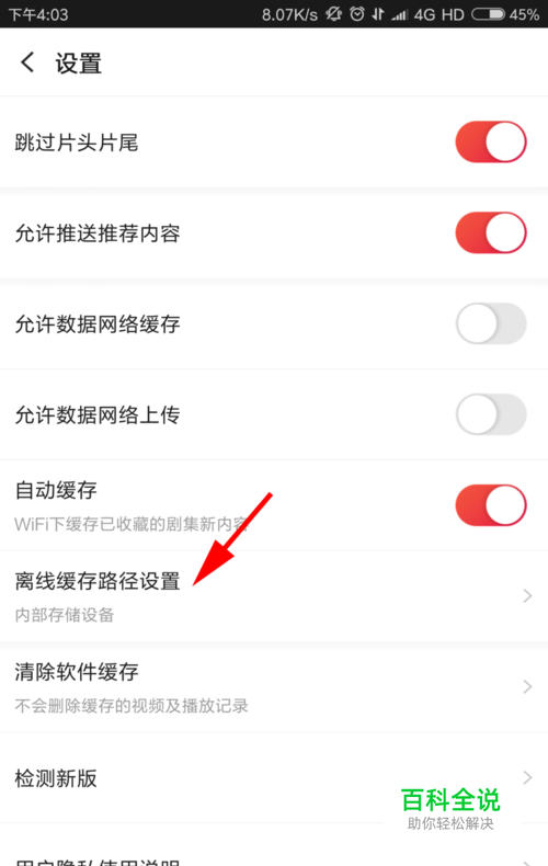 在搜狐视频设置界面可以查看离线缓存路径,但是只显示内部存储设备,具体文件夹查不到