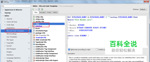 在Settings界面中,选择Editor下面的File and Code Templates,在右侧里面找到class和Interface