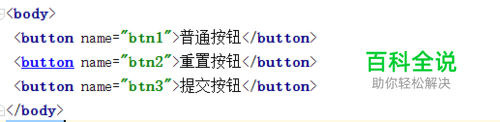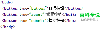 type : 表示按钮类型,通常与表单一起联用。 1. reset : 重置按钮 2. sumit : 提交按钮 3. button : 普通按钮 <button type="button">按钮</button>