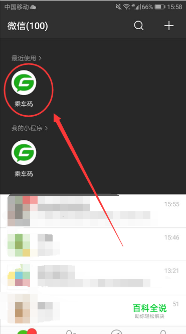 首先,打开手机微信首页往下拉动,查看小程序,然后打开 乘车码,如下图