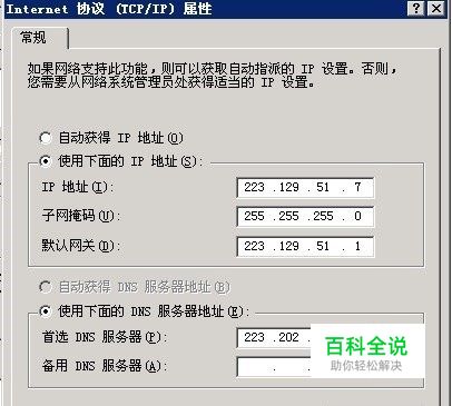 首先正确配置经常使用的网卡,比如外网卡,我们按照正常的方法,输入固定的IP地址、子网掩码、网关和DNS等信息,比如外网地址为223.129.51.7,网关为223.129.51.1,如下图所示: