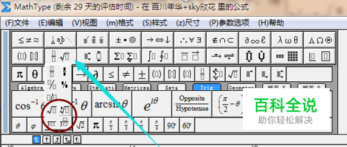 然后出现编辑器弹窗,会显示各种运算符号,例如:根号,这里我们找到根式的符号,选择点击,然后会出现在编辑栏中。