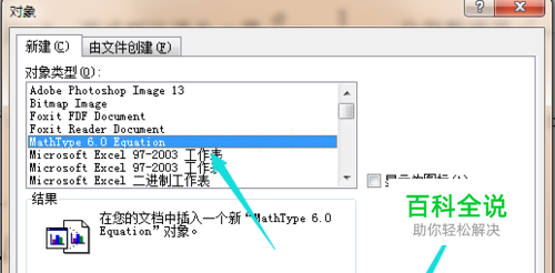 然后会弹出个小窗口,在对象类型中我们点击“mathtype(显示自己安装的编辑器版本)”,再点击确定。