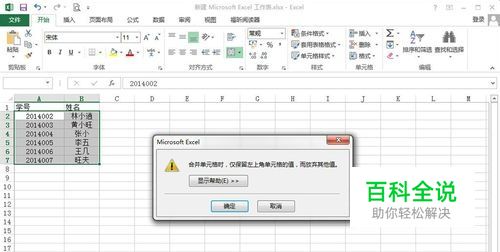 在合并excel两个单元格时,默认保留最左侧单元格的内容,合并时会有所提示;