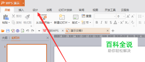 启动WPS演示后可以新建一个空白的文件,然后点击上方工具栏的 设计命令。