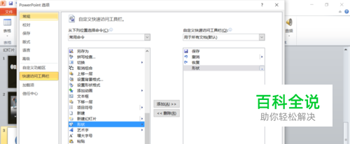 首先,如果ppt左上角没有形状工具,可以打开文件点击选项,再点击快速访问工具栏,找到形状将其添加到右侧方框中,关闭该界面后就将形状添加到左上角了。